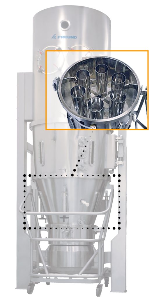 Wurster包衣系统特别适合从细粉(〜10微米)到小颗粒(2-3毫米)的颗粒包衣。它是由放置在流化床内部的组件组成。